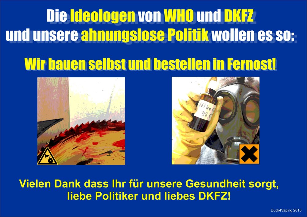 Die Dampfer werden sich zu helfen wissen16. Dezember 20156. September 2024Von DampfFreiheitBlog0 Kommentare Unter diesem Titel hat der Betreiber des Blogs DampfKampf ((http://www.dampfkampf.de/)) ein satirische Grafik bzgl. der Umsetzung der TPD2 in Deutschland erstellt:Quelle: http://www.dampfkampf.de/?p=365E-Mail teilen teilen teilen teilen teilen teilen teilen teilen teilen