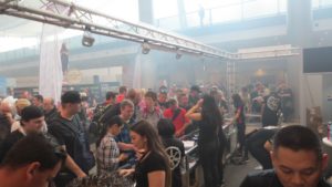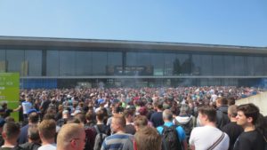 Dieses Mal war es einfach perfekt. Um 11:45 Uhr sind wir angekommen und sehen schon vor der Halle 1 eine riesige, dampfende Menschenmasse. Erster Gedanke, OMG das wird was geben. Aber dadurch, dass die große Halle mehrere Eingänge hat ist es wirklich geflutscht. Kurz nach 12:00 Uhr Messestart waren wir auch schon drin.