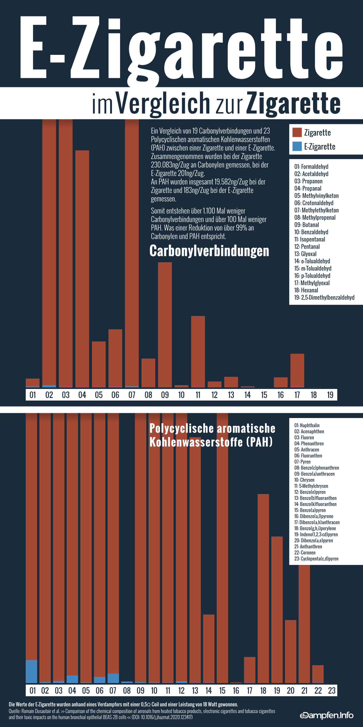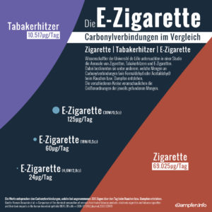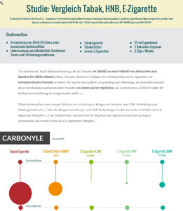 In einem Zug an dem Tabakerhitzer werden viel weniger Carbonylverbindungen (35μg/Zug) produziert als bei einer Tabakzigarette, bei welcher im Tabakrauch 230μg/Zug Carbonylverbindungen enthalten sind. Bei den E-Dampfprodukten waren diese Verbindungen nochmals 98,5% niedriger mit max. 0,4μg/Zug als bei Tabakerhitzer.