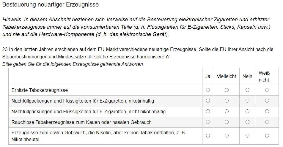 In den vorherigen Konsultationen 2016 und 2018 haben ca. 90% der teilnehmenden Verbraucher gegen eine Besteuerung von E-Dampfprodukte gestimmt.