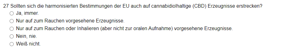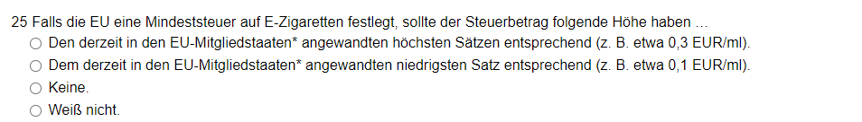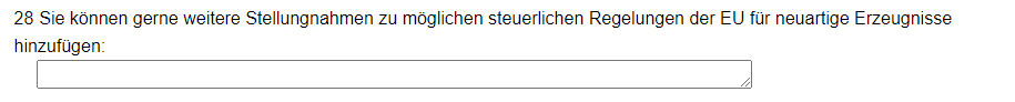 - Bei Frage 28 gibt es ein Freitextfeld um weitere Kommentare bzgl. einer möglichen Besteuerung von E-Dampfprodukte abgeben zu können