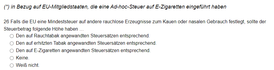 - Jetzt kommt der interessante Teil für Dampfer, die Fragen zur Besteuerung „Neuartiger Erzeugnisse“, sprich E-Zigarette und Tabakerhitzer