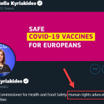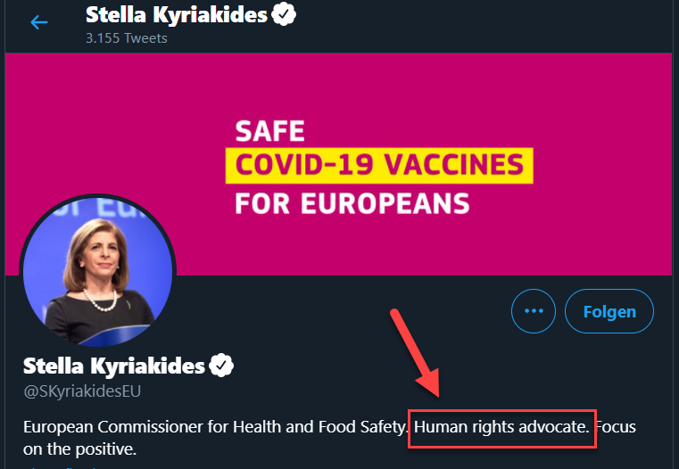 Die Antwort ist auch besonders dahingehend zynisch, da sich Frau Kyriakides auf Twitter in ihrem Profil 7 als Unterstützerin der Menschenrechte darstellt.