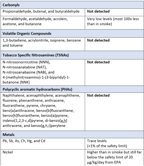 In dieser Studie wurde das Aerosol des Podsystems getestet und mit den durch die FDA vorgegebenen fünf Hauptkategorien für Giftstoffe im Tabakzigarettenrauch (Standardzigarette) abgeglichen.