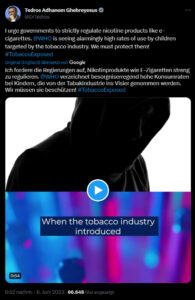 Der Leiter der WHO, Tedros Adhanom Ghebreyesus, bemüht mal wieder der armen “Kiiinder ™” , um erwachsenen Menschen den Umstieg vom Rauchen auf das Dampfen unmöglich zu machen.