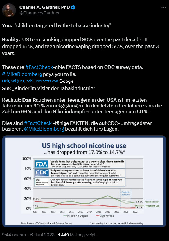 Auch für ihn stellen Aromen wie Gummibärchen oder Waldbeeren die Gefahr für Jugendliche schlechthin dar. Dabei steigt aktuell der Tabakkonsum unter Jugendlichen wieder an! Das ist eine absolute Verdrehung der Realität.