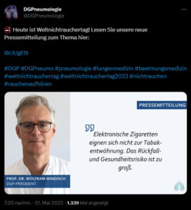 - DGP – Zum Weltnichtrauchertag am 31. Mai: „E-Zigaretten eignen sich nicht zur Tabakentwöhnung – Jugendliche besser aufklären“ https://web.archive.org/web/20230607091703/https://pneumologie.de/aktuelles-service/presse/pressemitteilungen/zum-weltnichtrauchertag-am-31-mai-e-zigaretten-eignen-sich-nicht-zur-tabakentwoehnung-jugendliche-besser-aufklaeren (Archiv-Link)