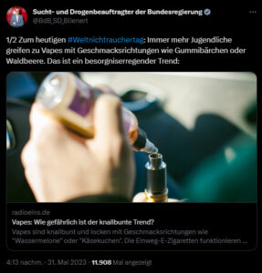 Festgestellt wird, dass die Zahl rauchender Jugendliche in den letzten zwei Jahren wieder angestiegen ist. Nicht aber wird hinterfragt, weshalb. Ein gewichtiger Grund, werden u.a. die politischen Coronamaßnahmen gewesen sein, unter welchen Jugendliche ganz besonders gelitten haben! Das steigen jugendlicher Dampfer kommt u.a. aufgrund der Disposables, welche vermutlich ohne JuSch-Prüfung an diversen Verkaufsstellen (Kioske, Tankstellen) angeboten werden, wo es mit dem JuSchG nicht so genau genommen wird. Hier wird der Staat seiner Kontrollaufgabe nicht gerecht! Der E-Dampfe die Schuld zu geben, ist zu kurz gesprungen.