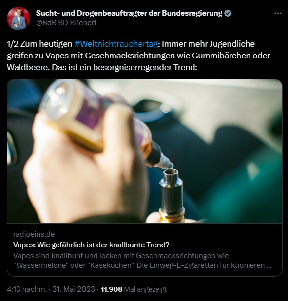 In die gleiche Kerbe bzgl. Aromenverbot für E-Dampfprodukte springt auch der Bundesdrogenbeauftragte Burkhard Blienert.