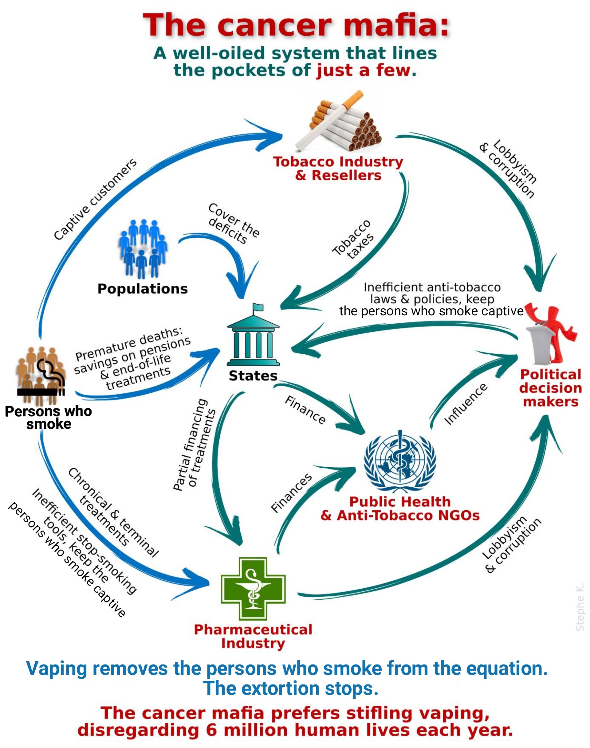 Viagra als der Kassenschlager der Pharmaindustrie ist längst abgelöst von Raucherentwöhnungsprodukten und entsprechenden verschreibungspflichtigen Pharmaka. Die pharmazeutische Industrie ist aber gleichzeitig einer der Hauptfinanziers der WHO. Und hat deswegen einen bedeutenden Einfluss auf deren Ausrichtung. Was ihr über deren Aktivitäten in Bezug auf Aufrufe zum Rauchstopp insoweit sehr von Nutzen ist, da grundsätzlich nur pharmakotherapeutische Interventionen oder NRT-Produkte empfohlen werden.