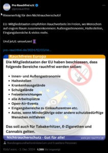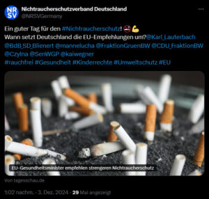 Die Anti-Raucher-Anti-Dampfer Organisationen jubeln auf X und fordern eine rasche Umsetzung in Deutschland.