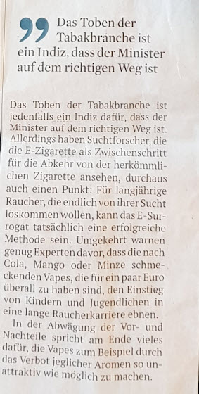 Der Kommentar übernimmt die politische Erzählung praktisch ungeprüft und bemüht unterschwellig auch die sog Einstiegsdrogenhypothese. Die immerzu als Totschlagargument präsentiert wird: Aromen führten Jugendliche in die Raucherkarriere, Sucht und Abhängigkeit. Das kann durch die großen Erhebungen zum Rauchverhalten – unter anderem vom Statistisches Bundesamt, dem Robert Koch-Institut und der Bundeszentrale für gesundheitliche Aufklärung sowie der DEBRA-Studie, nicht bestätigt werden.